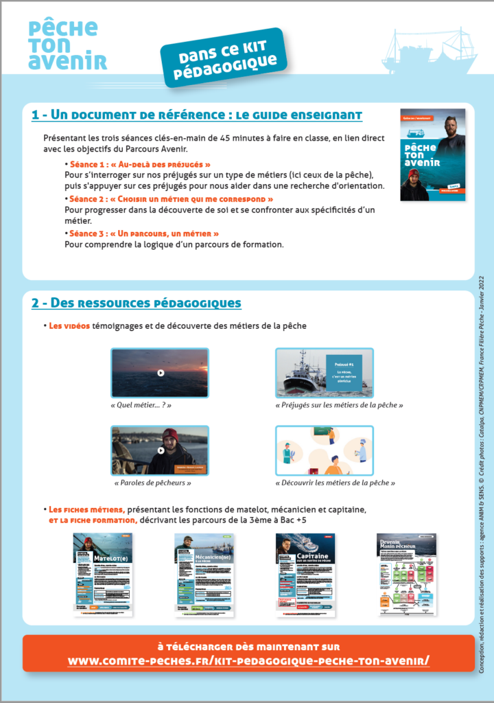 • Créer un kit pédagogique « Pêche ton avenir » à l’intention des enseignants de cycle 4 en lien avec Parcours Avenir présentant les métiers de la pêche qui s’appuie sur les compétences génériques et pratiques à acquérir pour bâtir son propre projet professionnel